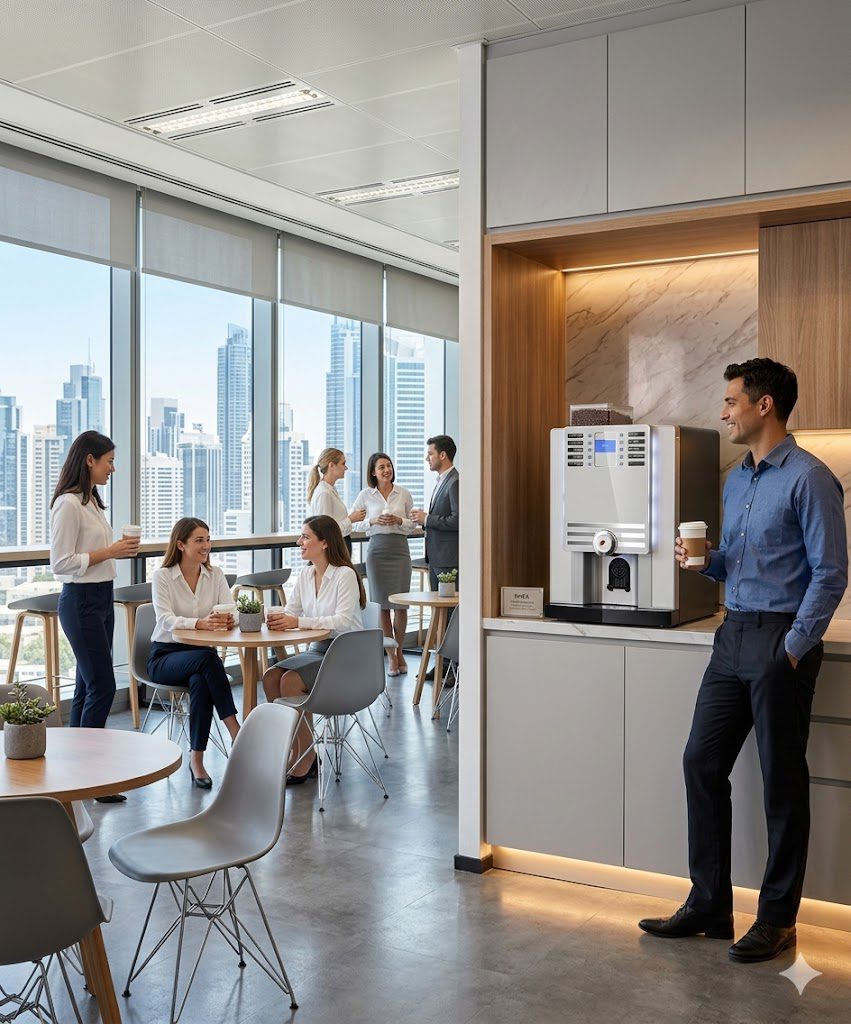 Su sistema de café espresso de alta presión y su capacidad para preparar múltiples bebidas —como cappuccino, latte, chocolate o té instantáneo— la convierten en una opción versátil tanto para oficinas, recepciones, coworks, tiendas y salas de espera.